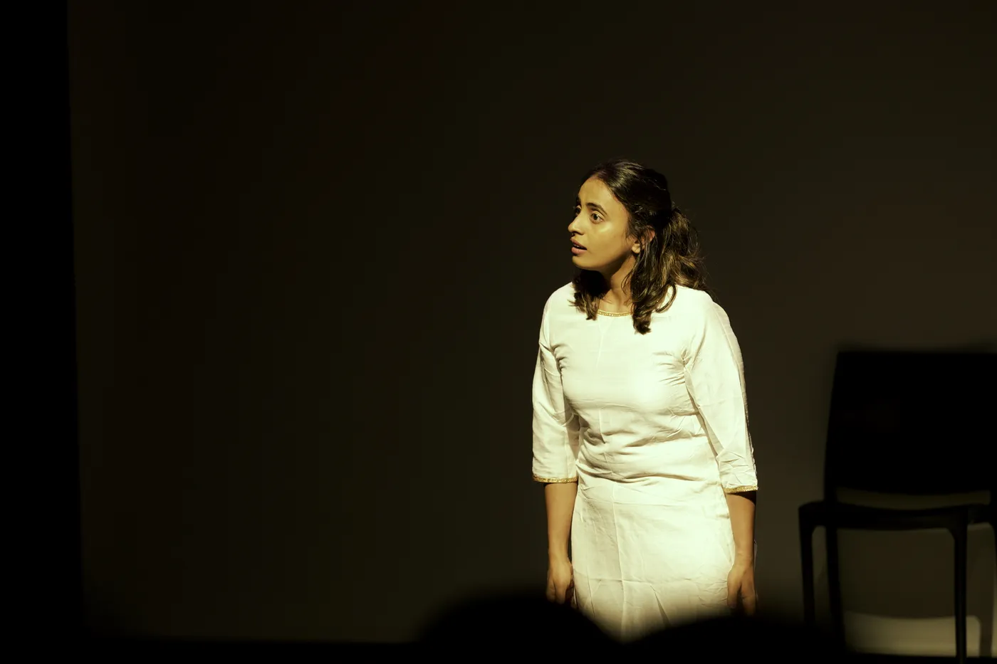 Janhavi performed a self-referential solo ‘Rehearsing the Almost’, which spoke in silences, moved in stillness, and laughed at its own yearning, mirroring the performer’s soul, reflecting both the beauty and futility of the artistic pursuit. A performer stood between silence and sound, between being and becoming. An actor is seen in dialogue with her only companions: a pair of dancing shoes that wait — patient, untouchable, and impossibly near. What began as a poetic monologue on the craft of performance later evolved in tonality, elegance giving way to absurdity. What began as a dialogue turned to a chase, with the shoes becoming unattainable symbols of mastery, self-worth, and fulfilment. By the climax, she is caught in a tragicomic loop — always reaching, never arriving — embodying the eternal hunger of creation that lingers on, unsatisfied, essential, alive.